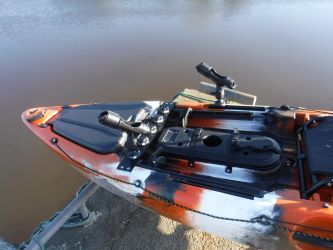 Kayak features - 2 # flush rod holders / 2 adjustable rod holders / bow starport accessory rail / 2 # side deck rails / central console / transducer scupper / aluminium chair / stern anchor storage and tankwell / toe operated rudder