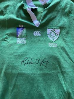 Claire Moore has kindly donated Malcolm O’Kelly’s 2003 World Cup jersey. Malcolm O'Kelly is an Irish former rugby union player who played as a lock for Ireland and Leinster. This is the Jersey Malcolm wore in the Romania World Cup game 2003.